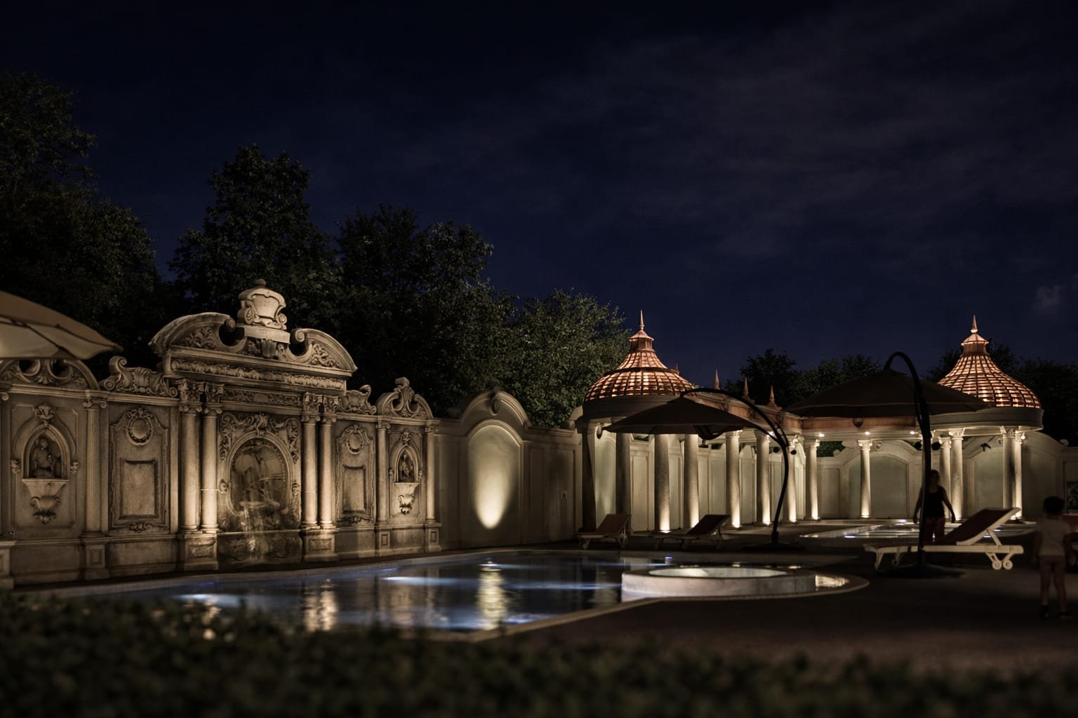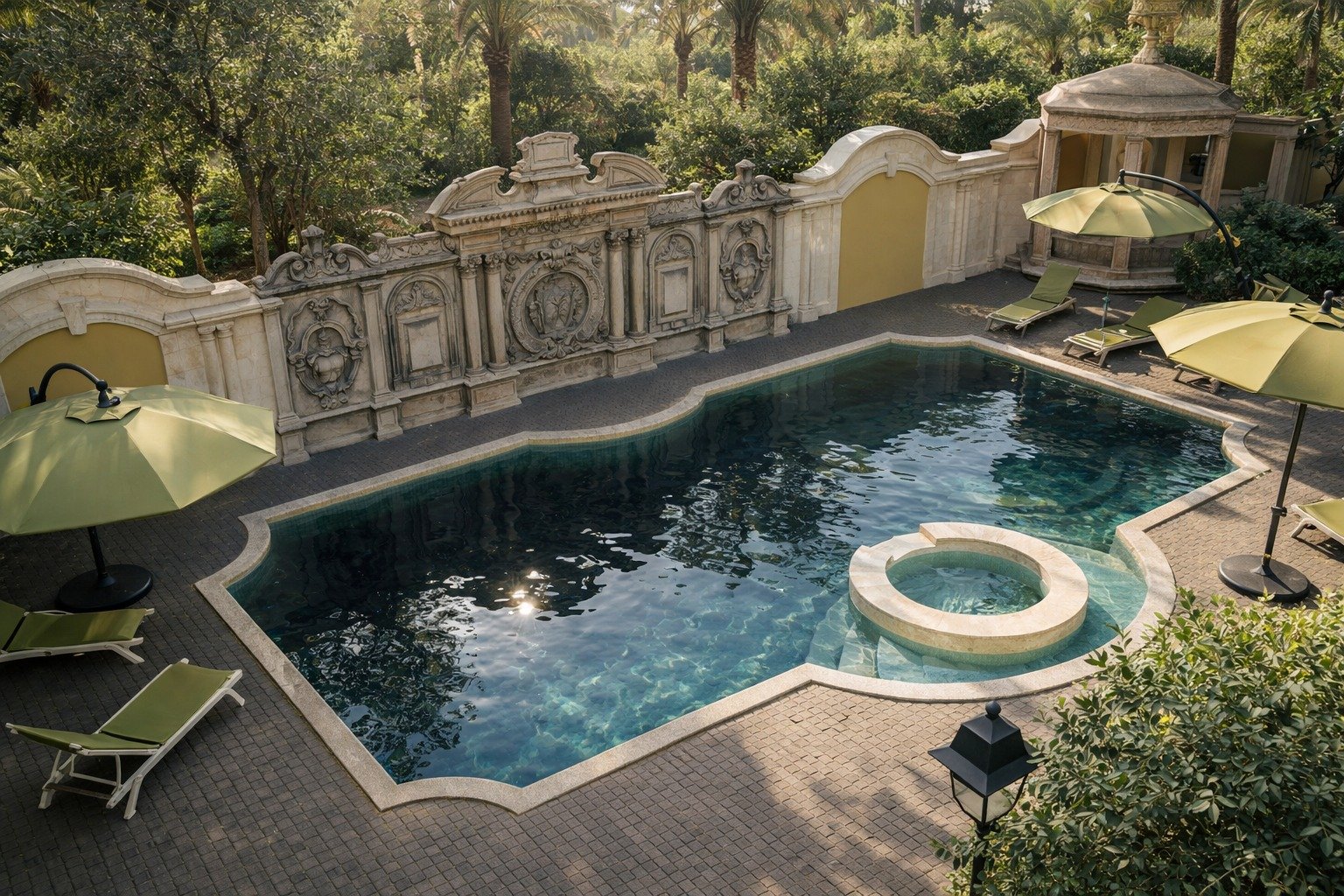 Curated landscape design with resort-style greenery, reflecting pools, and carefully placed botanical elements that complement the classical architecture at every turn.